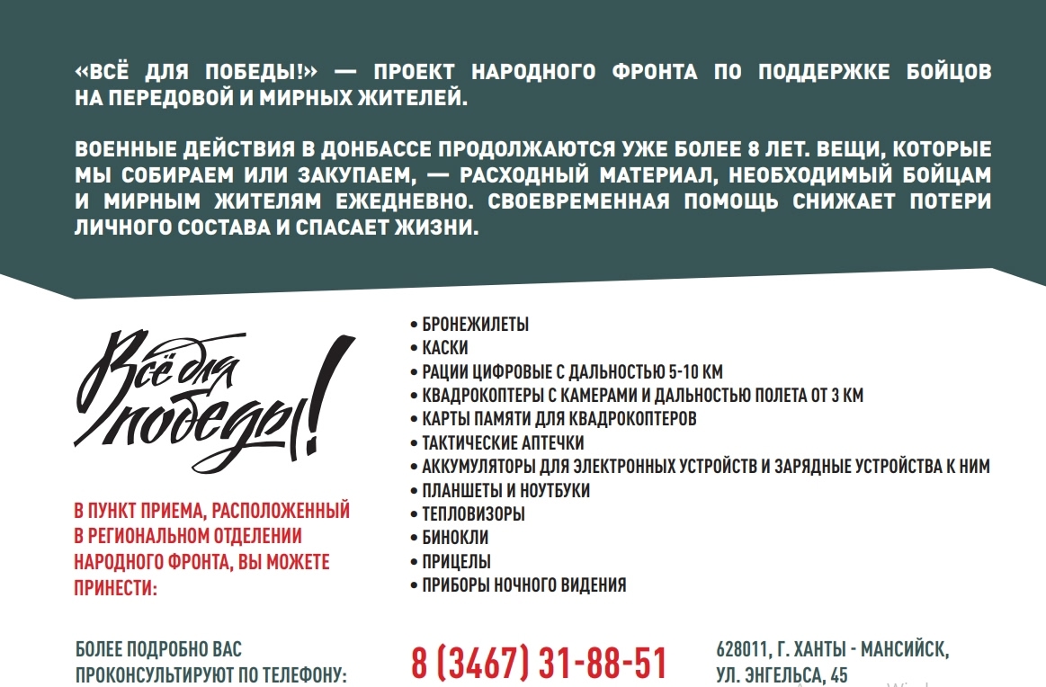 Региональный исполком общероссийского общественного движения «Народный фронт «За Россию» в Ханты-Мансийском автономном округе – Югре с гордостью объявляет о реализации проекта «Все для Победы!».
